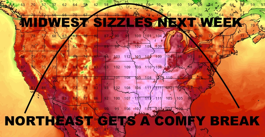 Your workweek starts out hot with near 90/low 90 temps for Monday under full sunshine; then we watch for that cold front we’ve been talking about for Tuesday. Things still remain unimpressive moisture-wise with this front, so I think our thunderstorm activity will be non-existent or very isolated. Either way, we go for low 80’s on Tuesday, and we will keep that momentum going till at least Thursday under full sunshine. Humidity may increase Friday and we may go slightly warmer, but we’ll hold off because what’s going on with the tropics on the West Coast, could indirectly impact us here on the East Coast jet stream-wise.
