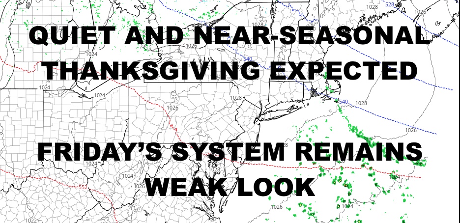 Good morning everyone. The unseasonably cold air is out of the area, replaced by more seasonal type temps typical for late November. Meanwhile, Friday’s system maintains its weak look, and your holiday weekend remains rather quiet aside from the chance of some showers Sunday (maybe).