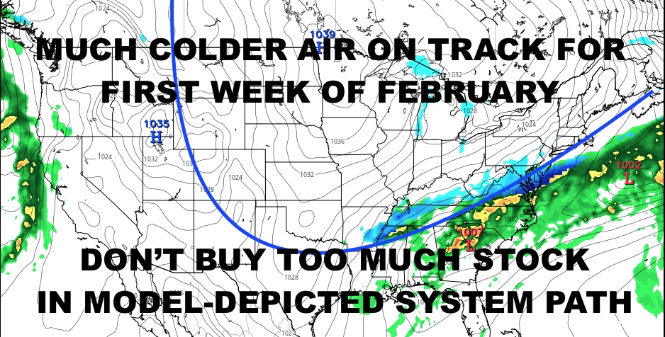 While it may not seem so, the colder air is actually on schedule for that 1st week of February we discussed in last week’s long range. For now though, that’s all we have as far as good-probability. Our models are very wonky in terms of systems beyond the next 7 days and they should not be trusted.