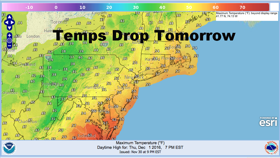 NYC RAIN MAKES FINAL PUSH – Our last batch of rain is about to enter the area. This will most likely be our heaviest rain in the past two days. Expect a few rumbles of thunder and localized flooding in poor drainage areas in the next few hours. Everything is gone by about 2-3am and we begin the partial clearing process. Lows overnight will only get down to 50, then the sun returns for tomorrow. We’ll have sunny skies and breezy conditions, with highs in the low to mid 50’s, but dropping off over the course of the day as cooler air filters in behind the system. Lows tomorrow night will be in the mid to upper 30’s, so bundle up if you’re going to see the Christmas tree at Rockefeller Center.
