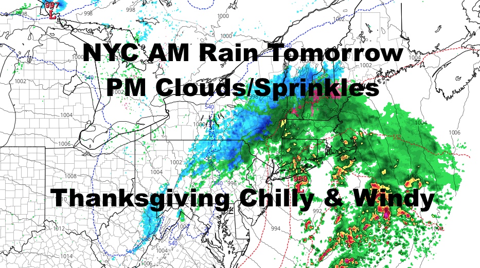 Good morning everyone. We have a sunny start today before a Nor’easter-like system brings steady rain overnight tonight and into tomorrow. Interior parts of the Northeast and New England could see a parting shot of snow as everything leaves, then we’re left with a quiet week until our next system on Wednesday. That’ll help shape our Thanksgiving Day forecast, which I’ll explain below.
