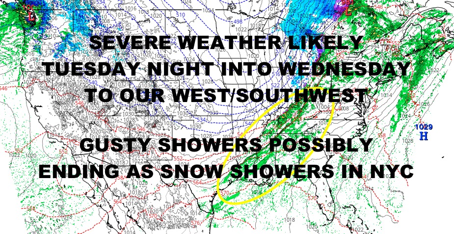 For the Northeast and New England, we’re expecting a windy time ahead of this front, with on and off gusty showers and a few rumbles later on Wednesday. The line of mild air to cold air is very sharp, and we could see a changeover from rain to snow Wednesday night before things come to an end early Thursday AM. The best chance to quick changeover and some whitening of the ground, will be interior parts of the Northeast & New England.