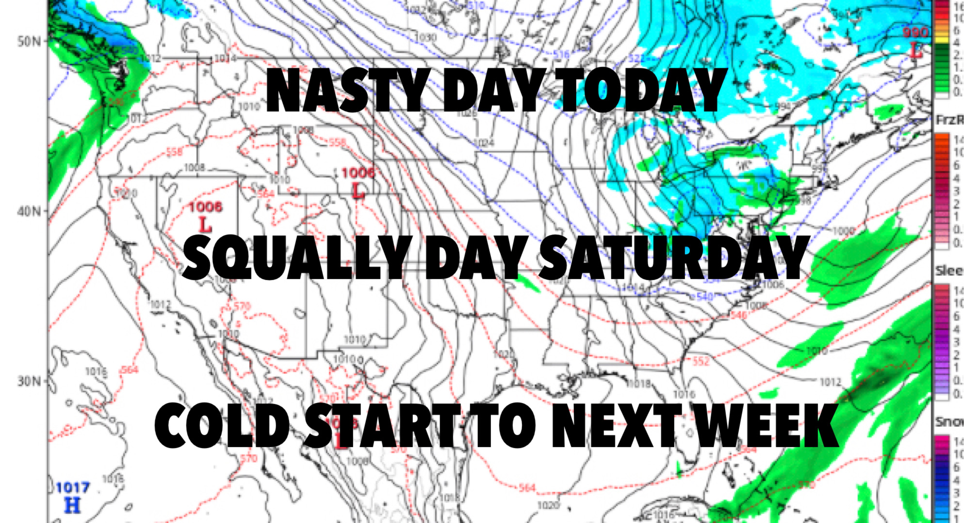 Good morning everyone. We have a busy day ahead today, as well as our weekend and start to next work week. One batch of rain is exiting the area, but rain will return later on and stick with us through early AM tomorrow. Then we’ll be watching for some squally conditions Saturday afternoon as cold air moves in behind departing low pressure.
