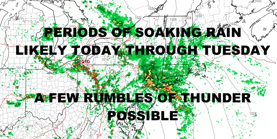 Look for on a nd off rain today, heavy at times, with the chance of a few rumbles of thunder. Highs will be in the 65-70 range.