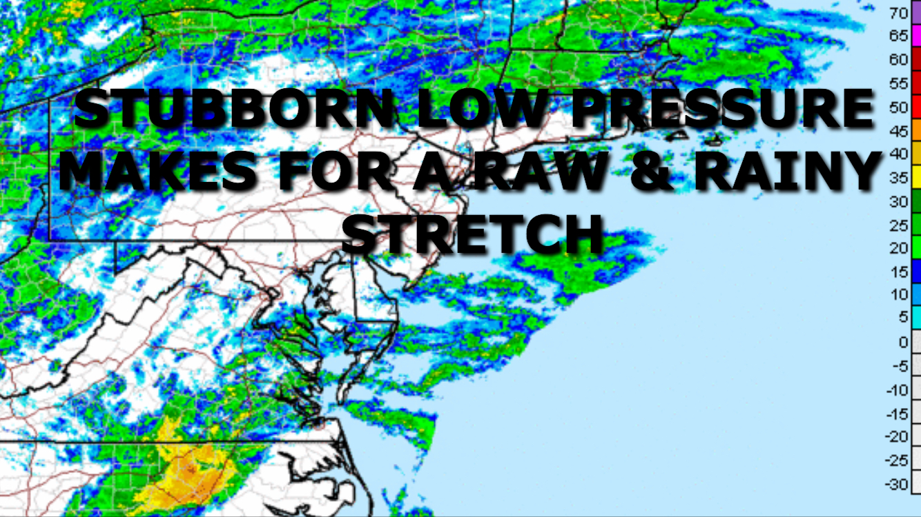 NYC RAINY RAW CONDITIONS STUBBORN DEPARTURE – Greetings again from Washington D.C., where I’m sending NYC the weather I’ve been experiencing the last few days. Cloudy, periods of rain, and overall raw weather conditions will be with the NYC area for longer than previously expected. The stubborn low continues to be stubborn, with periods of rain and damp, brisk, easterly winds lasting into tomorrow night. Highs today and tomorrow will feel like a late October/November-like 50’s with the clouds and rain.