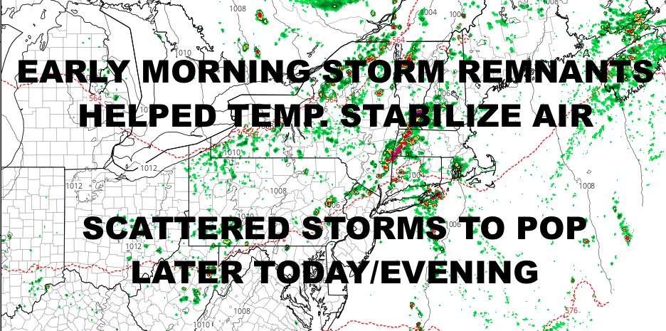 For today, that rain will slowly pass to our east, then we should see some sun & clouds with highs in the low 80’s. Storms will fire up again later, with most of the action upstate. However, we could see some scattered storms down here with the highest chance of action being northern areas of the NYC area, the North Shore of Long Island, and the East end.