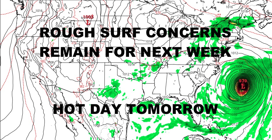 Good morning everyone. We continue to watch Hurricane Erin and her peak fringe effects likely to take shape Tuesday – Thursday in the form of rough surf and rip currents. Other than that, we don’t have much going on aside from a hot day tomorrow, then very mild/warm temps during the workweek.