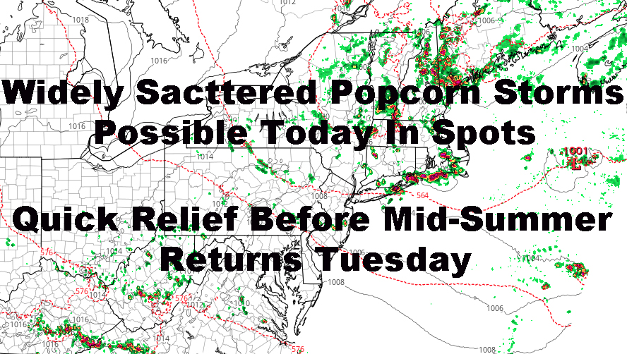 Good morning everyone. After a rough day in spots yesterday storm-wise, with hot and humid temps, we’ll have a more comfortable day today; but with leftover instability, we could see some widely scattered storms popping. Meanwhile, our relief today and tomorrow is temporary, with deep summer returning quickly this week coming up.