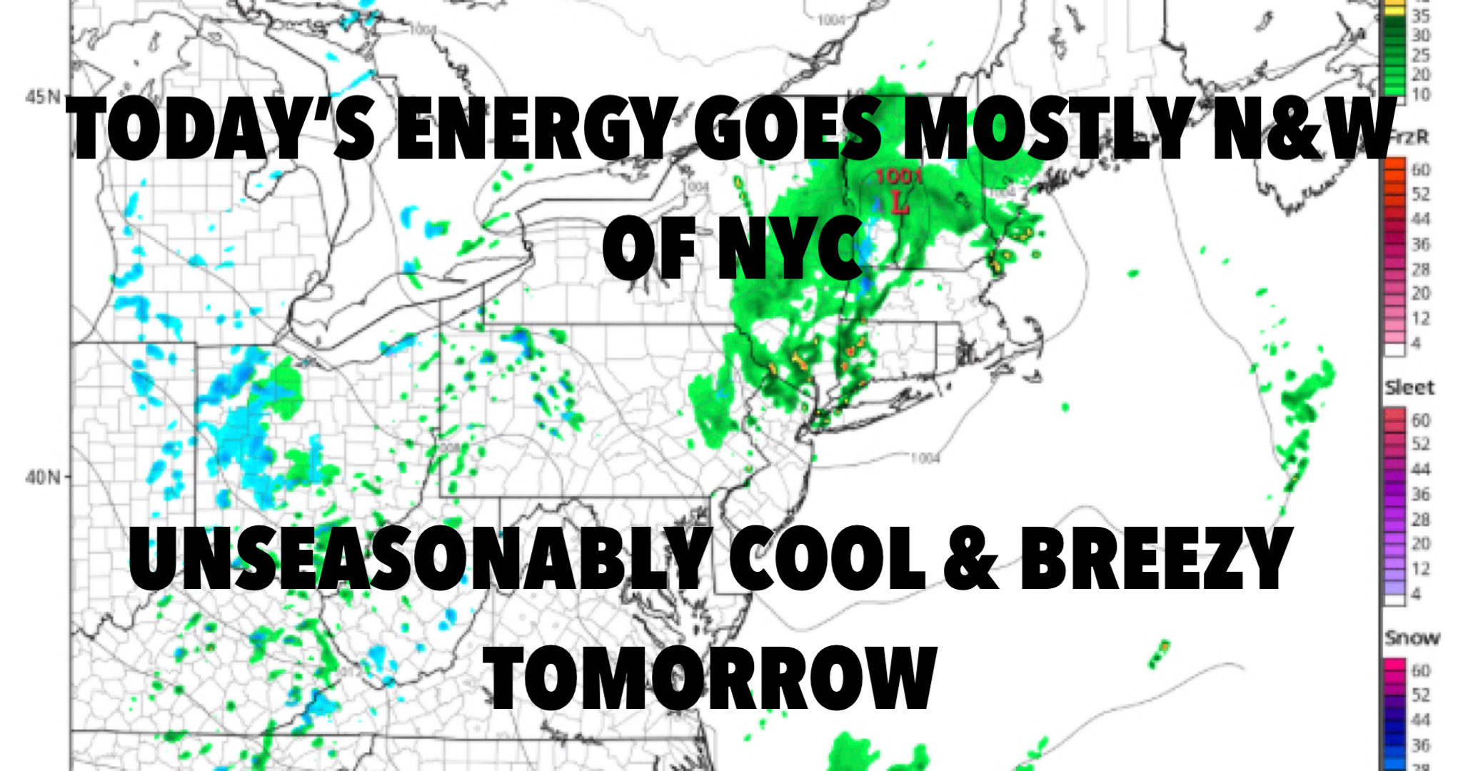 Clouds are in, but we could see some blue patches today. Low pressure goes N&W of NYC, but we could see some tail-end action in the form of scattered showers and storms. Any storm we may see, could contain small hail and gusty winds. Highs today in the mid to upper 50’s.