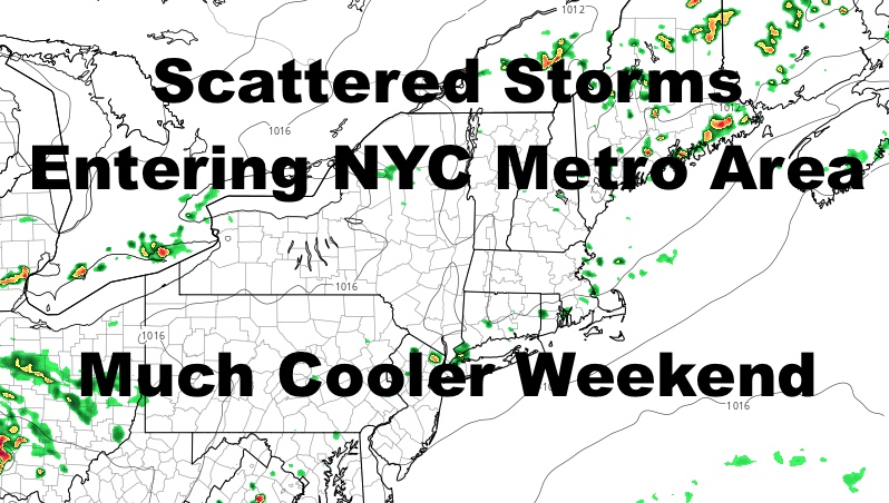 Good afternoon everyone. Scattered heavy thundershowers are entering and transiting the area as we speak, giving us locally heavy rain, gusty winds, and some possible small hail in isolated spots. This process will help bring in cooler conditions tomorrow, but moisture and clouds will get hung up in the area. What was supposed to be a sunny day tomorrow, will be delayed till Sunday. After that, very warm to hot conditions move in next week for a few days.