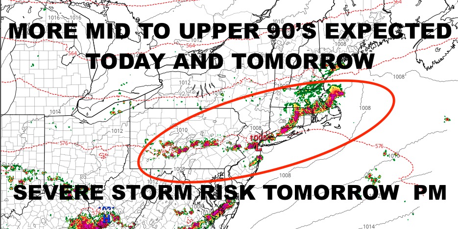 Good afternoon everyone. The extremely hot and uncomfortable weather conditions continue as our heatwave marches on. It’ll come to a screeching halt late Saturday, but it’ll come at the cost of severe storms in the NYC Metro Area. The thunderstorm line will also come down from a NNW angle, which is the worst way when it comes to severe weather risk in our area. After that, we cool down significantly, with low to mid 80’s expected Sunday through at least Friday.