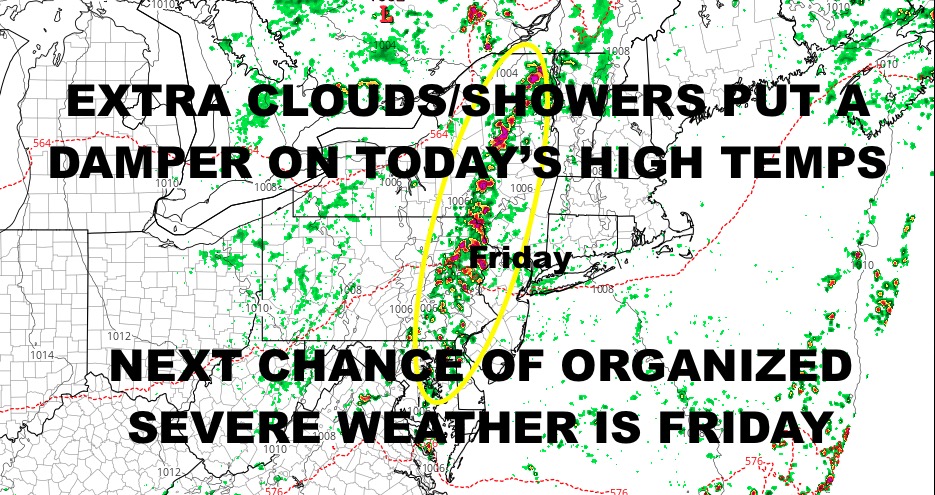 Good afternoon everyone. A complex of showers and storms moving off the coast of New Jersey has expanded and grown out just enough, it is skirting parts of the area; especially the south shore of New York City and Long Island. This will keep clouds in the area for a prolonged amount of time, holding temperatures back from making it to near 90 today. Very warm conditions return tomorrow, and we still remain on the lookout for severe weather prospects for Friday. Meanwhile, your weekend remains looking beautiful relative to the standards we’ve been dealing with the past 4-6 weeks.