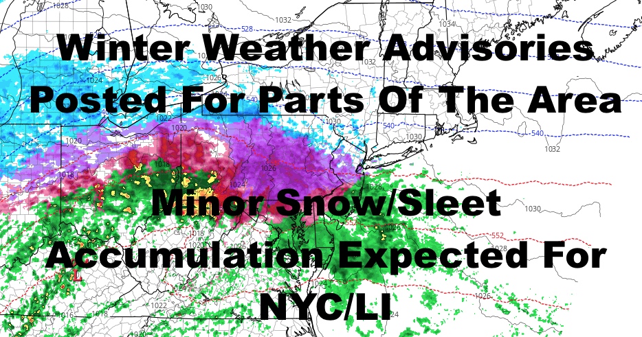 Good morning everyone. Things continue to come together for tonight & tomorrow’s overrunning precip event, and the forecast is holding rather steady. Winter Weather Advisories have been posted for the NYC area and parts of Long Island, showing that we do have some wintry precip on the way; but also confirms that this is a minor event for our area. We’re fine-tuning timelines today, then we’ll await for the “fun” to begin and watch the radar/cold air closely.