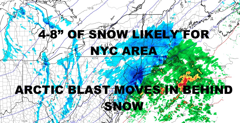 Clouds lower and thicken today, with snow possibly beginning as some light rain. Highs will be in the upper 30’s, then begin to drop as precipitation starts. Overnight and as snow is falling, we drop into the teens, so snow will certainly stick; with a layer of ice possibly underneath it from whatever initially melted. Look for 4-7″ total for the NYC area, possibly higher if snow changes over earlier and/or we see some heavier convection.