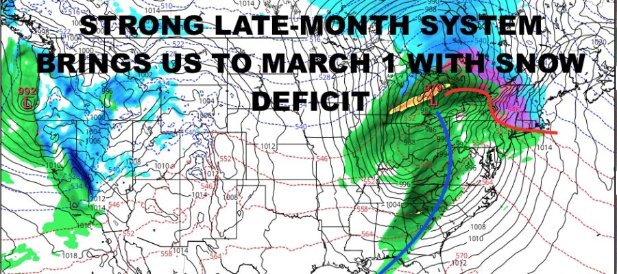 Good morning everyone. Although we have some cold air sneaking in here and there, with the chance of some mixed precip and/or light snow, we’re heading into the first week of March with hardly any snow. A very large system towards the end of month that’ll keep us in the “warm” sector with its West and North track, will seal the deal for February and put us in a very bad spot to start March.