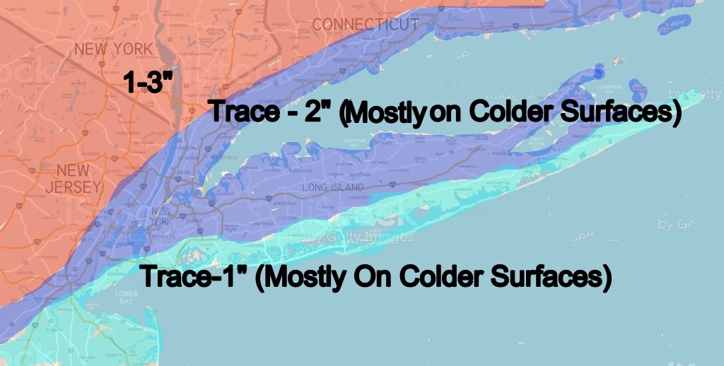 For the City and interior parts of Long Island, including the North Shore, North Fork, and northern parts the South Fork, we’re going with a trace-2″, with the 2″ mark occurring if it doesn’t take too long to accumulate. Either way, I’m thinking most of this occurs on colder surfaces, such as tree limbs, cars, grass, and deck surfaces.