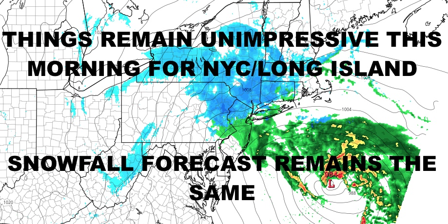 Good morning everyone. Our next system is knocking on our door, but things remain unimpressive for the NYC/Long Island area. There’s a lot that has to happen in order to get our rain to change to snow, and then the same factor that MIGHT change us to snow, may also change us back to rain (if there’s a changeover at all).