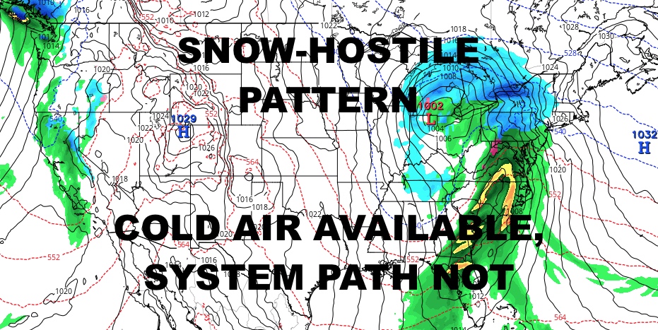 Good morning everyone and happy Saturday. We begin to settle into this mish-mosh pattern where we are cool/chilly, but not overtly cold. We’re also having a problem with our system paths, which is also why we’re not going very cold even though there’s very cold air available. For now, we remain relatively quiet, but we are watching a big storm brewing for late week into the weekend. That being said, it looks as of now that it won’t work out for us in terms of major snow for the NYC Metro Area.