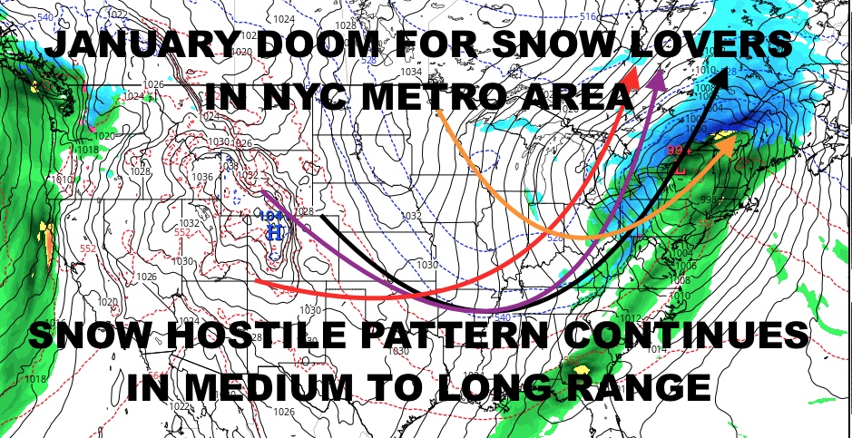 As far as temps are concerned, we’re really not that above normal aside from the milder air just ahead of these systems. Average high in the dead of winter is 39 for NYC, so while we get much colder of course, winter for NYC isn’t 20’s throughout the season. This means that are high today in the upper 30’s to low 40’s, is pretty much just about average or a degree or two above average if we make it to 42.