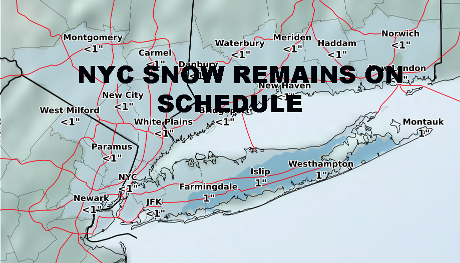 NYC SNOW NOW LIKELY – Above is the current NWS snowfall potential, below is my gut feeling on what will most likely be the final outcome based on what I’m seeing. I think this system is going to be energized somewhat more and avoid being mostly suppressed by the cold air moving in. Snow will begin as flurries late tomorrow afternoon, with periods of steady light snow by tomorrow night, highs in the mid 30’s. Snow will become steadier overnight tomorrow and go into Friday morning, making Friday morning’s rush hour a challenge due to slippery roads and temps below freezing. Please use caution when traveling as small amounts of snow on the road can be more dangerous than a foot. Give yourself some extra time and be ready to clean your cars, warm them up, and defrost them Friday morning. Highs Friday will be in the low to mid 30’s, low’s in the mid 20’s at night.