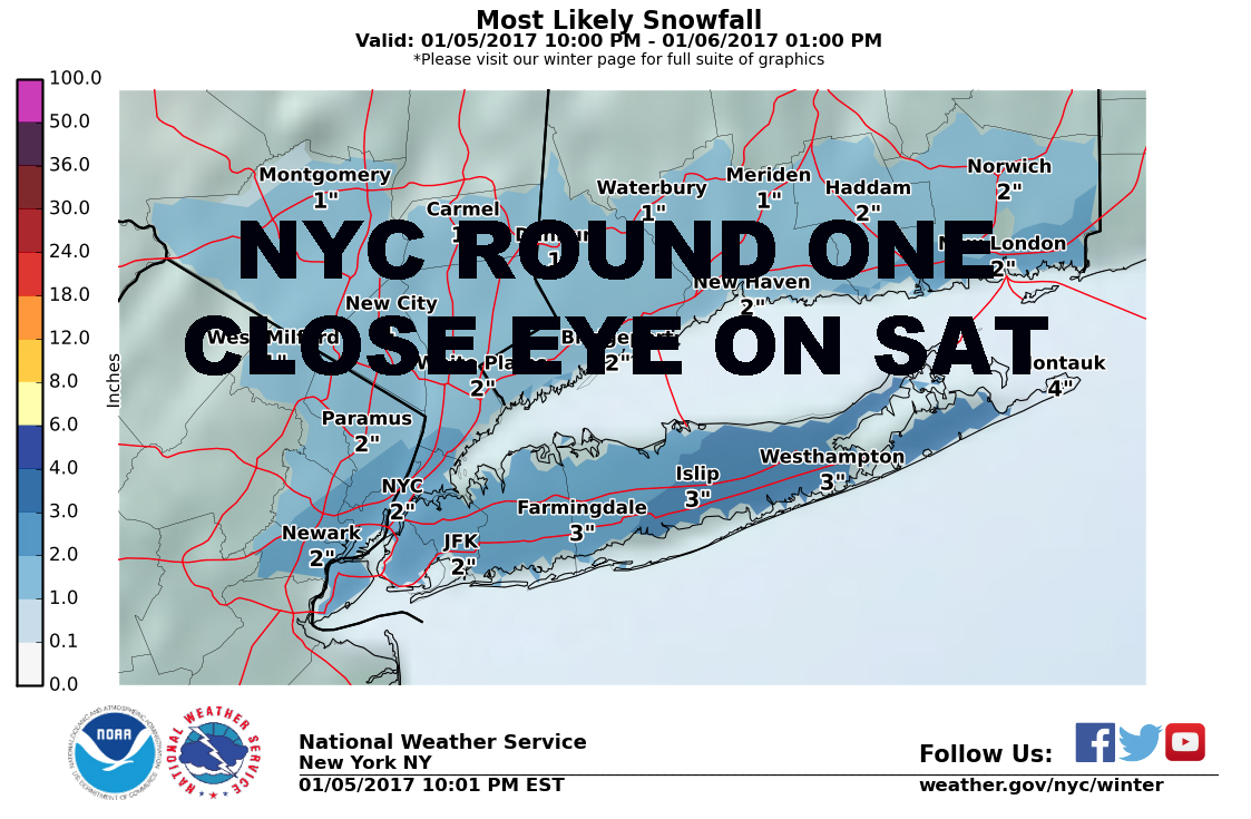 NYC SNOW ROUND ONE – Light snow is on our doorstep and should begin in the NYC area within the next 2 hours. The National Weather Service has caught up to my original forecast and the consensus is that 1-3″ is expected in most of the area aside from the east end of Long Island and Coastal NJ, which may see 2-4″ in some spots. Snow will be with us until around just after sunrise, then partial clearing tomorrow with highs in the mid 30’s. Tomorrow night will be unseasonably cold, with lows in the upper teens to near 20. Then we turn our eyes to Saturday, where we’re watching a close call unfold.