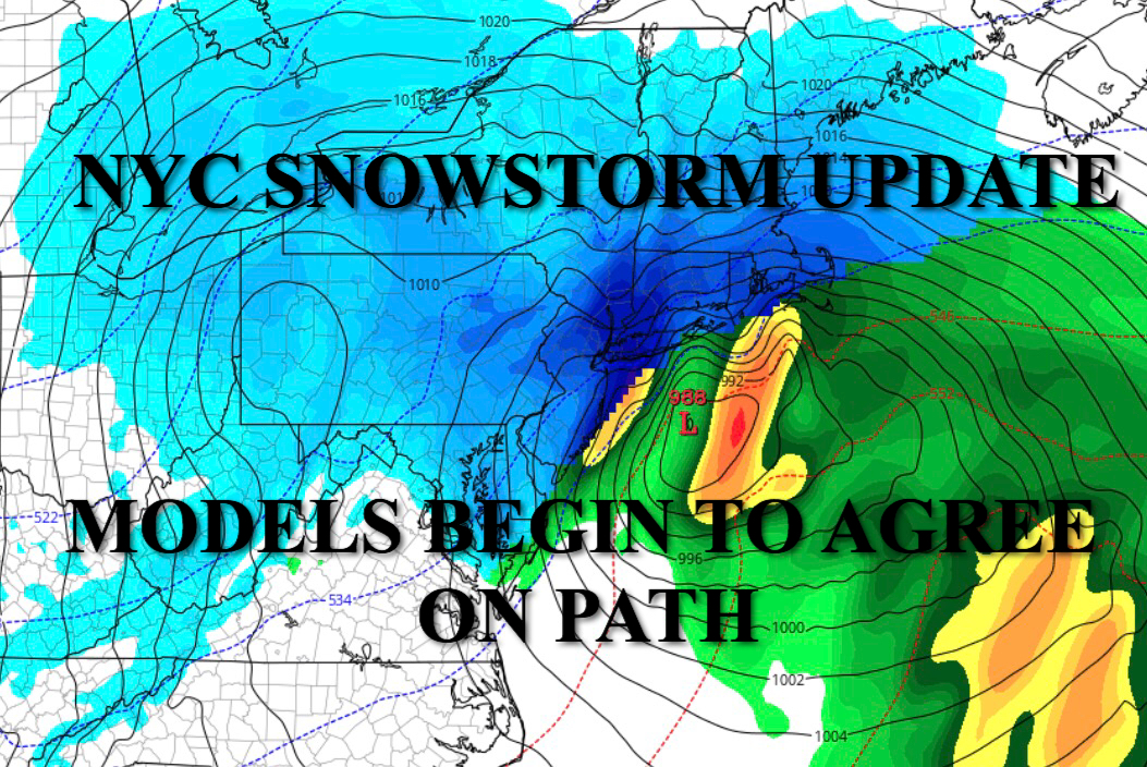 NYC SNOWSTORM UPDATE MODEL AGREEMENT – Late last night, the GFS took another dip inland, making for a sloppy scenario for the NYC area. However, it has corrected itself and has now popped in line with the EURO and many other models. At this point, it’s safe to say we’ve established a general path give or take 50-100 miles. This margin of error could make a difference for some localized areas, but if the path holds, most of the NYC area will see a mostly snow event.