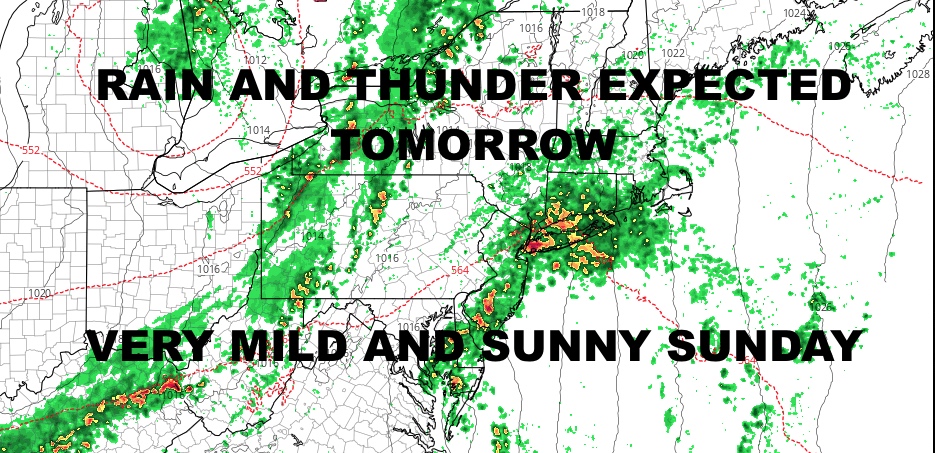 Tomorrow we’ll have rain in two batches. First, our coastal moisture will trek across the area from the SSW/SSE mid morning through early afternoon. This batch will give us the heaviest rain of the two, plus the chance of a few embedded rumbles. Our second batch of rain will be front-related and scattered in nature. With this one, the majority of the energy goes to our north. Highs will be a humid 65-70, cooler at the immediate shore.