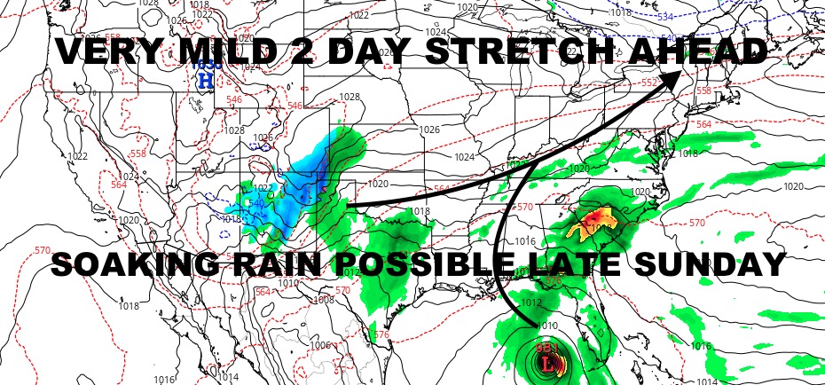 Look for sunshine on Saturday, then increasing clouds late; highs near 60. Clouds lower and thicken on Sunday with the chance of a few showers by afternoon. Look for steadier rain to head in by late in the evening and/or overnight hours.