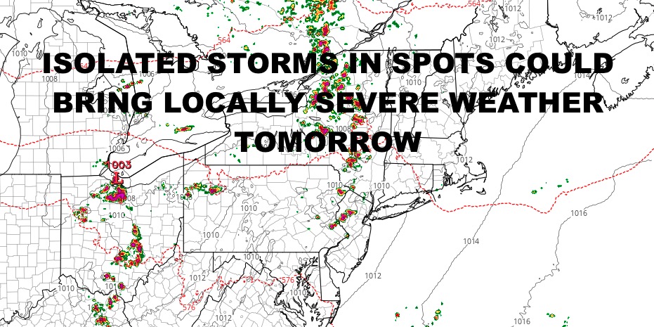 Tomorrow we notch up the heat with sunshine for most of the day. Expect highs in the upper 80’s, and that combined with some instability passing by, could spark some isolated strong to severe storms. For those who do see any action, hail and damaging winds will be the biggest risk.