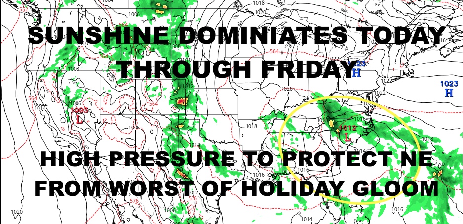 Good morning everyone. We have and dry and fairly spectacular workweek unfolding as we speak. Today is on the very mild to warm side and we’ll tamper things down a bit, but we remain mild and sunny throughout. Also we have some positive news for the holiday weekend. It won’t be 100% perfect, but we also won’t be like the Southeast, trapped in the doom and gloom.