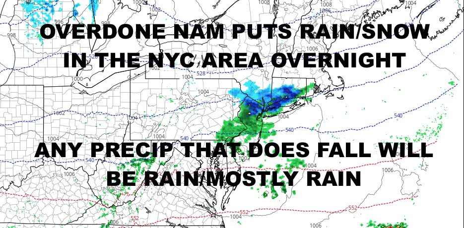 For today, we’ll have some AM sunshine, then increasing clouds and highs a mild 55-60. Some moisture transits through overnight, giving us the chance of some rain showers into tomorrow. If we get some moderate echos, it could create enough cooling to see some wet snowflakes or sleet mixed in overnight and early tomorrow AM. Mostly likely, the majority of light to moderate snow will be confined to areas N&W of the NYC area and in higher elevations.