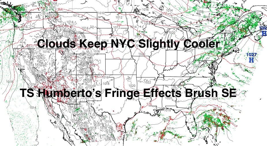 Hello Angry Ben fans and followers. Some extra clouds visiting the area today will keep things seasonal, but we should have them out of the way by tomorrow morning for a nice warm day in the NYC Metro Area. Tropical Storm Humberto has formed, but the Southeast will only feel fringe effects such as gusty showers, rough surf, and slightly enhanced tides, before it pulls out to sea. Overall it’s a quiet week, and I will run it down for you.