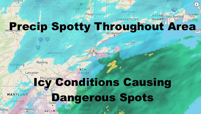 As of now, most of the heaviest precip is staying offshore, with a few heavier echos bushing the Forks of Long Island. The radar has done a terrible job picking up the lighter precip, and also differentiating the snow from the sleet and freezing rain. Some heavier snow and sleet is trying to develop SW of Philadelphia, but the band looks on the thin side. We’ll see if the radar fills in to see if today’s wave of energy can finish the job of getting those with 3″ of snow, to 4″ and bring them into range.
