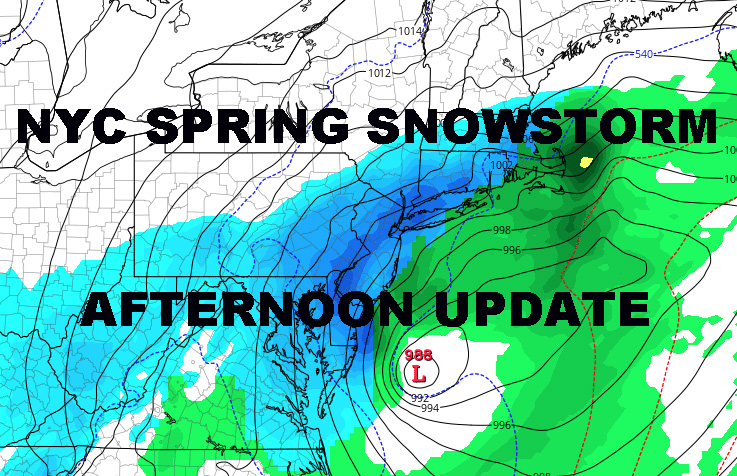 NYC SPRING NOREASTER SNOWSTORM AFTERNOON UPDATE – Good afternoon everyone. In case you haven’t heard, Spring has failed to initialize, winter continues, and snow is on the way. How much continues to remain in question, but it’s going to be a good, rip-roaring Nor’easter for the New York City metro area regardless.