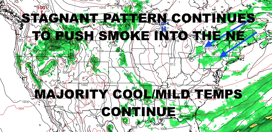 Good afternoon everyone. Low pressure meandering in the Nova Scotia area continues to send smoke from the Canadian wildfires our way. This is going to be an issue for a while and is really causing havoc air quality-wise. Expect smoke and haze to come and go over the next couple of weeks depending on the wind profile. In other news, temps ranging from 70-80 dominate the forecast with no short/medium range end in sight for this blocking pattern.