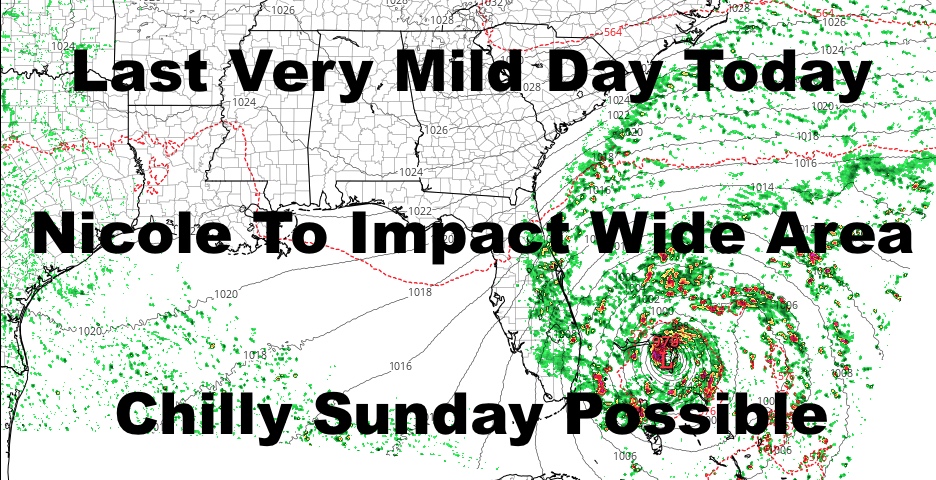 As that front moves away and Nicole’s center rides up the front, very chilly air will be pulled down behind it. Saturday remains somewhat seasonable with partial clearing late, but Sunday looks to be in the mid to upper 40’s for the moment. We’ll keep an eye on it all, as well as any potential impact Nicole will have for the Southeast.