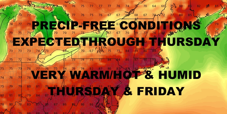 On Wednesday, we start to get in the very warm realm as highs creep up into the mid 80 range. We’ll also see a slight uptick in the humidity. Thursday is downright very warm/hot and humid, with highs in the upper 80’s to near 90.