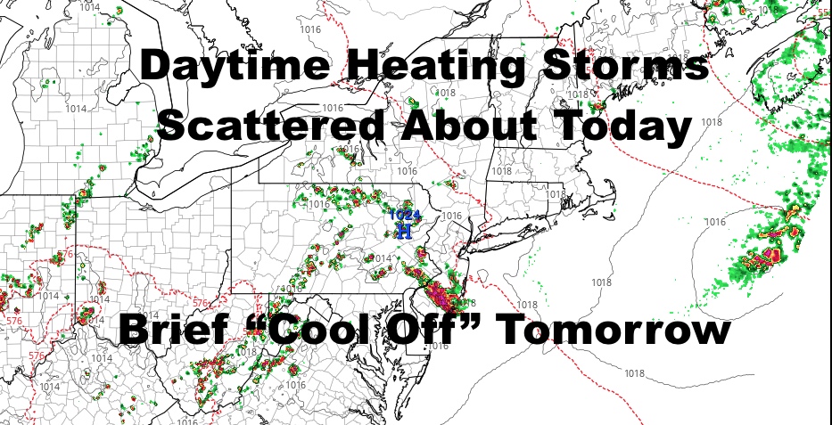 Sunshine will be with us all morning, then a slight wind shift to light southeast winds will increase the moisture throughout the area. Expect thunderstorms to begin popping up mid to late afternoon in the Northeast. Typically with this setup on a hot day, we’ll see most of the action just inland from the coast, but we could see some stray action in the NYC/Long Island area as well. Anything that does pop up will be strong in nature, and possibly locally severe. Highs today will be in the near 90 to low 90 range.