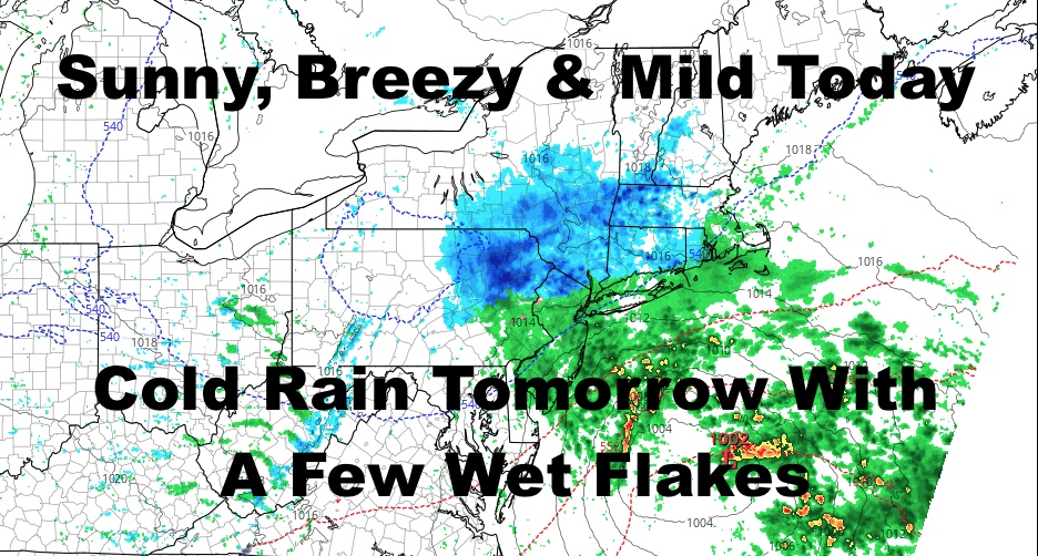 Good morning everyone. We have a beautiful but breezy/windy day today, then typical NY winter returns tomorrow as a weak coastal system passes by to our south. It’ll be too weak to pull enough cold air down and make everything snow, but it’ll be just enough to keep things feeling raw with a few wet flakes possible too.