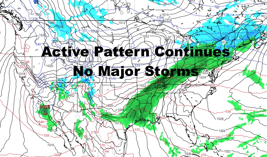 Overall, we’re in a very active pattern but nothing conducive for big snows or even big storms in general. Continue to look for weak to moderate systems trekking across the Country, or waves developing after passing systems stall out down south. We’ll keep an eye out for any surprises, but we remain locked in a generally snow-hostile pattern.