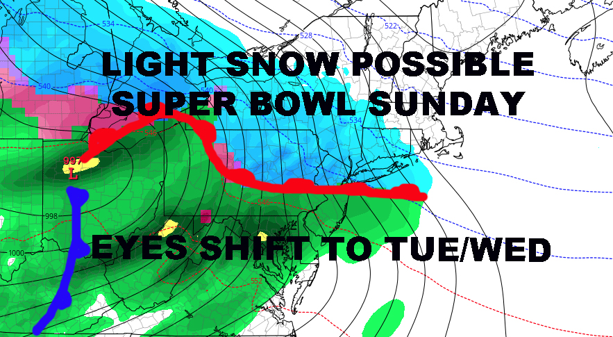 NYC SUPER BOWL SUNDAY LIGHT SNOW POSSIBLE – Good morning folks, sorry for the technical difficulties yesterday. Fortunately, there wasn’t much going on during the day and we can resume our discussion in regards to the possible snow on Super Bowl Sunday; as well as start focusing our attention into mid-week. When you look at long term patterns and see a large system brewing in models and hand made charts, it’s usually +/- two days in terms of time frame. This seems to be the case as the system we were watching for Super Bowl Sunday and Monday, will actually be the one for Tuesday into Wednesday.