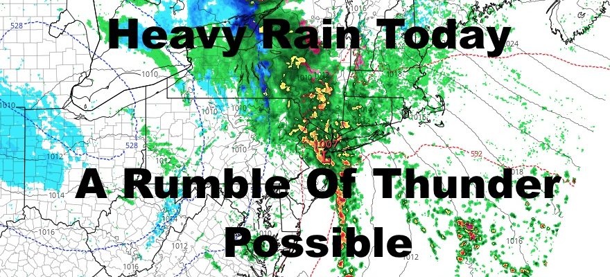 Expect rain, heavy at times beginning over the course of the next few hours. If you hear a rumble of thunder out there, don’t be surprised either as low pressure intensifies. Localized flooding is possible in poor drainage areas. Highs today will be in the mid to upper 40’s.