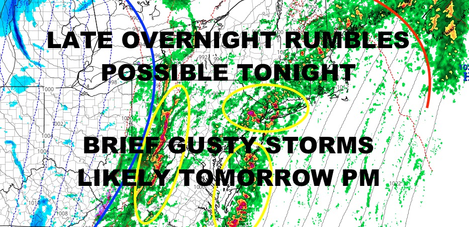 Good afternoon everyone. We have some unsettled weather heading our way as a shape cold front arrives tomorrow, and moisture ahead of it rides up the coast. Clouds are here and rain/thunder will arrive tonight, then scattered gusty storms tomorrow. As far as severe weather is concerned, the best chance to see some stronger storms will be to the west of us, but we could still see some thunderstorms contain damaging winds tomorrow afternoon and evening. We’ll also see the risk of some snow mixing in as cold air rushes in and moisture cages behind the front; then maybe some scattered snow showers on Tuesday with very cold air aloft.