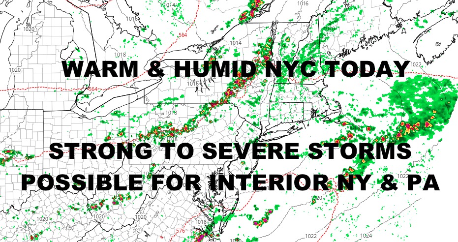 Our low pressure system that brought isolated severe weather to parts of Iowa, Illinois, and Michigan, will be riding into Canada today and sweeping its “tail” across New York and Pennsylvania. While the rain is confined to the coastal plain, Catskills, and Allegheny, look for a narrow line of heavy thunderstorms to develop from western NY down into central PA. That wave bumping up against sunshine and high humidity, will provide the energy and lift needed to help create some nasty weather.