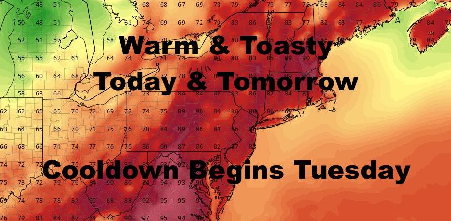 Look for sunshine today with a few high clouds. Light westerlies will help warm things up quickly, then we go southwest early as everything is moving a little faster schedule-wise. Expect highs in the upper 80’s to near 90, cooler at the shore due to the SW flow.