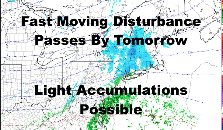 The best chance to see accumulating snow will be areas N&W of the NYC area, and maybe the northern fringe of NYC such as the upper Bronx. If that wave forms, areas may see a quick 1-3″. If it doesn’t, expect a dusting to an inch.