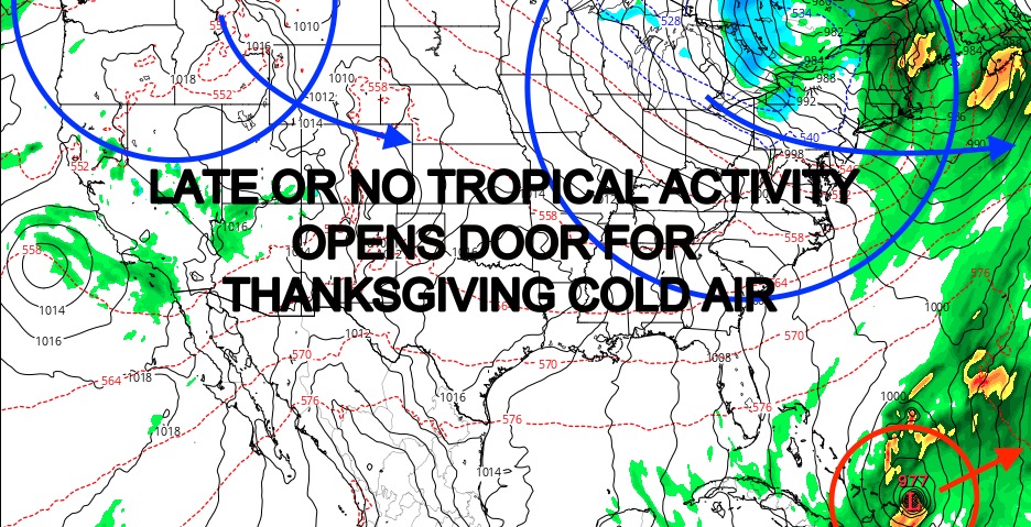 The most important factor was whether or not we saw any tropical activity coming up from the lower Caribbean. Had we got something going by today or the next day or two, it would’ve been just enough to delay the cold air for Thanksgiving Weekend (or have it arrive at the very end). However, the prospects of tropical activity is fading, and will either not happen at all, or too late to make a difference on this batch of cold air.