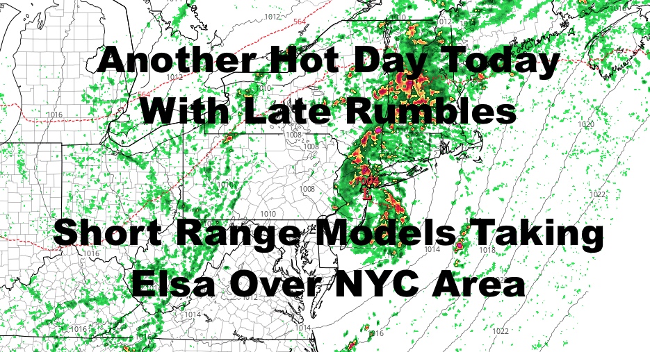 Good morning everyone. We continue our busy forecast as heat returns today, a lesser prospect of severe weather, and an increased chance that Tropical Storm Elsa makes a very close pass to our area here in NYC. Our approaching front has slowed down a little bit, and that closes the door for some things, and opens the door for others.