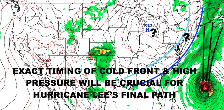 As of this moment, Hurricane Lee is looking ragged and weekend from some unfriendly atmosphere it has bumped into. Winds are now down to 115mph, but things should relax and Lee should gain some momentum again strength-wise. Before it makes its turn north, we expect Lee to expand in size, and possibly reach Category 4 status again. After that, we will be watching very closely the timing of our next front and positioning of high pressure. This is why as of now, it’s impossible to predict the outcome of this and Lee’s final path.