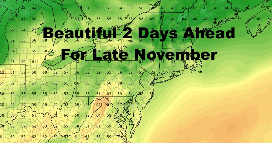 Good morning everyone. Considering we’re approaching late November, we have 2 beautiful days ahead before things become unsettled again, followed by cooler air. We also seem to be entering a slightly more active pattern in terms of systems, and Thanksgiving Day may wind up being a rainy one.